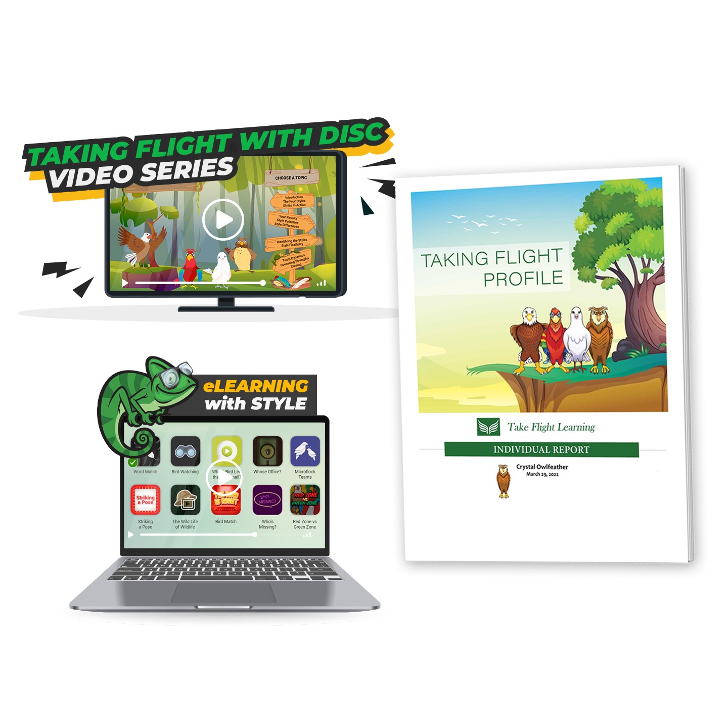 The Taking Flight Profile (A DISC Assessment) features the bird styles from Merrick Rosenberg’s books, Taking Flight! and The Chameleon.